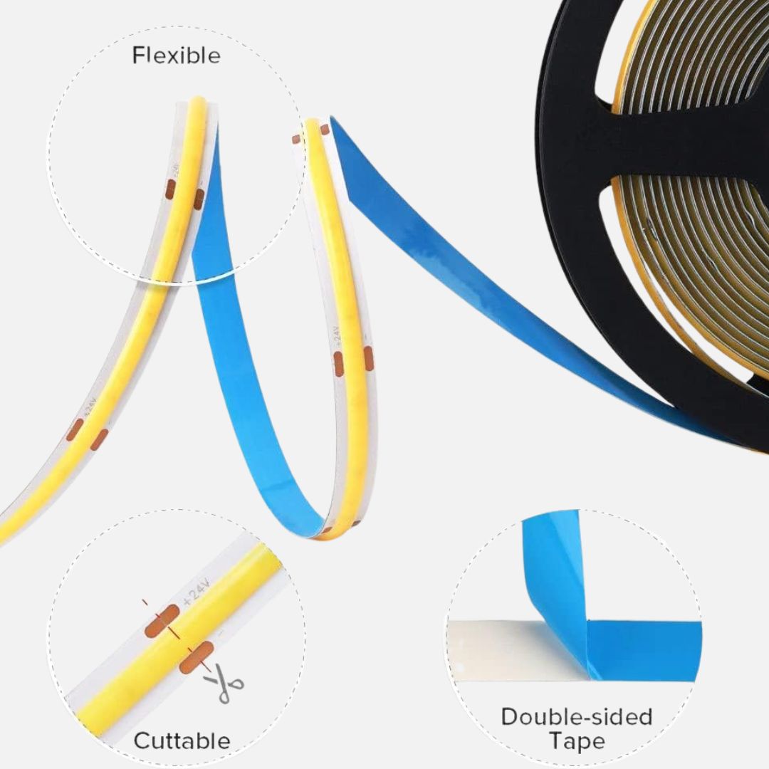 Upgrade your home lighting with the 5m COB LED Light Strip 480 LEDs/m, designed to deliver ultra-bright, high-uniformity illumination for bedrooms, kitchens, hallways, and interior décor projects. This advanced 24V LED strip light uses innovative FCOB (Flexible Chip on Board) technology, featuring 480 LEDs per meter – a total of 2400 LEDs across 5 meters—to produce a smooth, dot-free beam with exceptional brightness and clarity. Emitting a warm white 3000K glow, it enhances ambience while providing gentle, eye-friendly illumination perfect for daily living spaces.