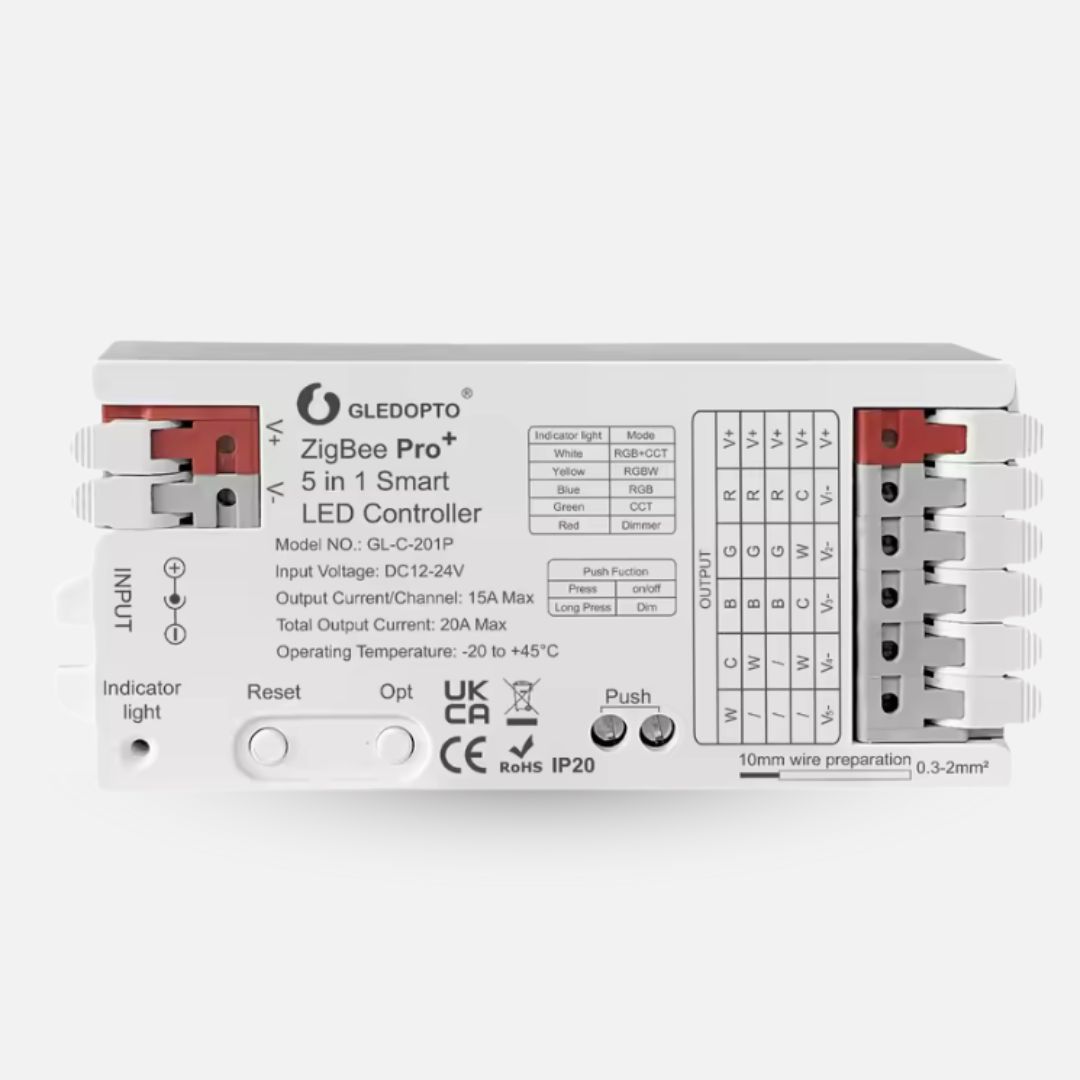 The GLEDOPTO ZigBee 3.0 Pro+ LED Light Strip Smart Controller 5 in 1 12V 24Vย is a versatile, high-performance lighting controller. Designed for users who want seamless control of LED strip lighting across multiple smart home platforms. Engineered with a robust 20A maximum total output current. Compatible with 12โ24V DC, it supports longer LED strip lights – up to approximately 15โ20 meters. Its durable ABS construction, intuitive wiring system, and advanced control options make it suitable for both residential and commercial lighting installations.