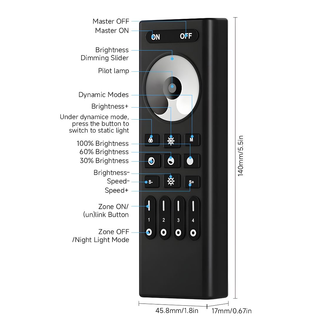 Auto-transmitting and auto-synchronisation technology ensures smooth, unified lighting effects even in larger installations, with wireless signal transmission distances of up to 98ft (30m) in open environments. The RC01RFB remote features a touch wheel and button design for easy, precise brightness adjustment, allowing you to tailor your lighting exactly to your preferences.