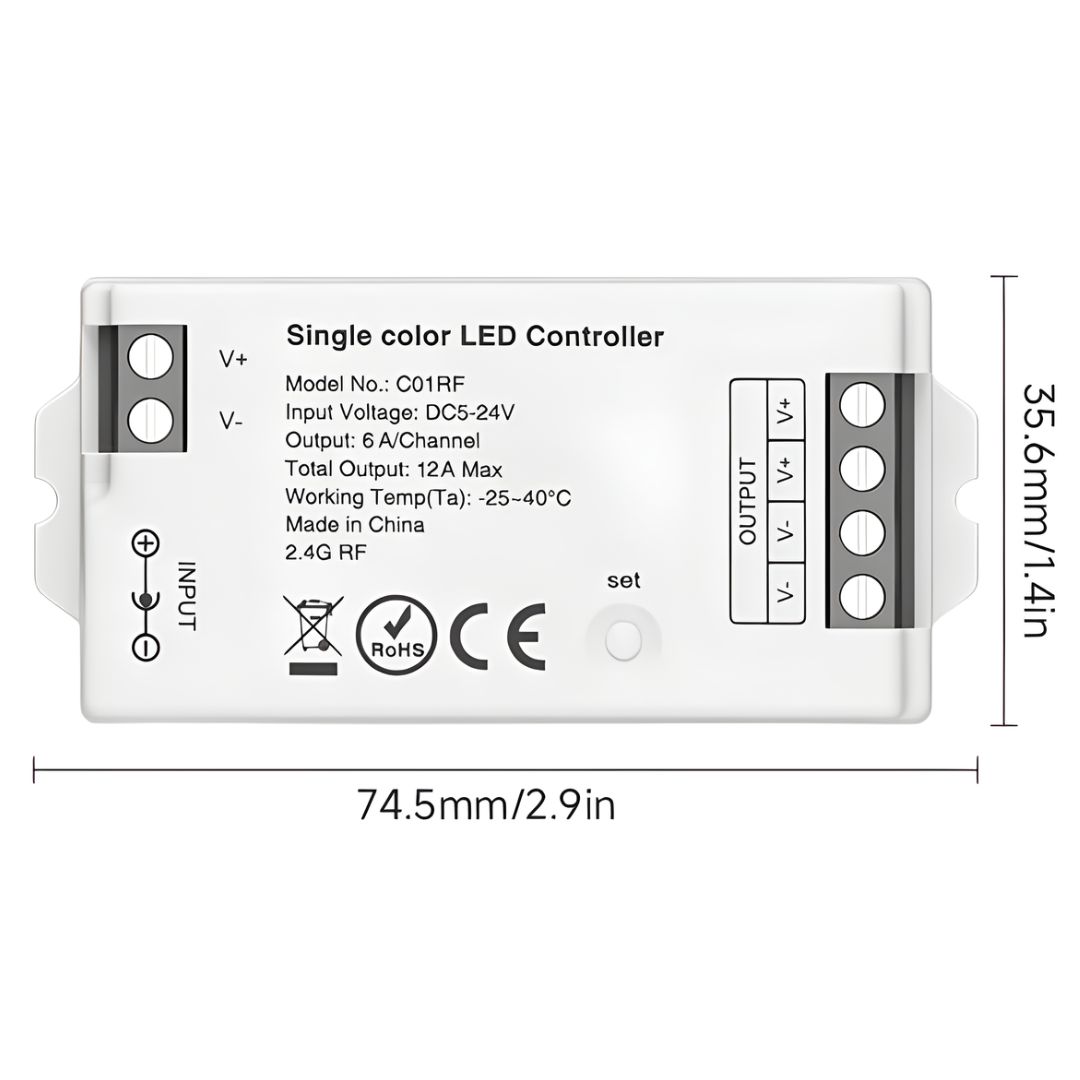 Enhance your single-colour LED lighting setup with the Wireless Remote + Controller for COB PWM Single Colour Light Strip, a versatile and reliable control solution designed for a wide range of PWM LED strip systems. Ideal for home, commercial and project installations, this kit supports 2-pin (+V โV) single-colour LED strip lights including 5050SMD, 3528SMD, 5630SMD and COB variants. Delivering a total output capacity of up to 12A and up to 288W at 24V, it ensures stable performance for both small and large lighting setups.